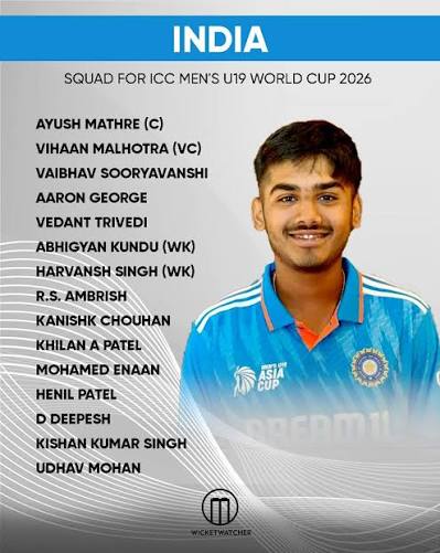 U19 world cup 2026 india squad:- आयुष म्हात्रे को भारत की अंडर-19 क्रिकेट टीम का कप्तान नियुक्त किया गया है, जो 2026 में होने वाले आईसीसी अंडर-19 विश्व कप में टीम का नेतृत्व करेंगे। बीसीसीआई द्वारा 27 दिसंबर 2025 को की गई इस घोषणा के साथ ही भारत ने अपने छठे यू-19 विश्व कप खिताब की तैयारियों को औपचारिक रूप दे दिया है। टीम में 15 खिलाड़ियों को शामिल किया गया है, जिसमें तेलंगाना के प्रतिभाशाली ऑलराउंडर अंकित कौरव को उप-कप्तान बनाया गया है। यह टूर्नामेंट जनवरी-फरवरी 2026 में आयोजित किया जाना है, हालांकि आधिकारिक कार्यक्रम और स्थान अभी घोषित नहीं किए गए हैं।